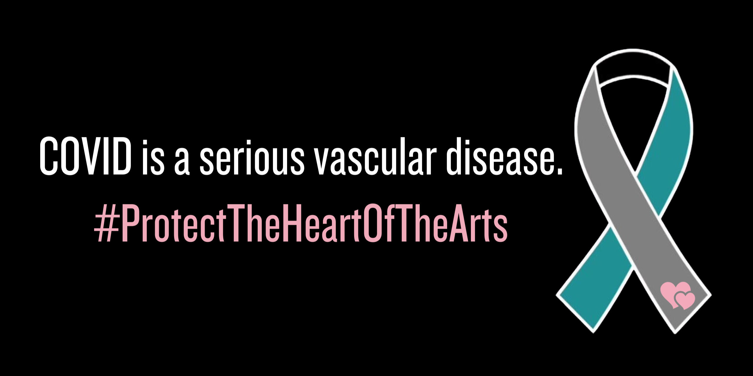 The original awareness ribbon was designed by @haziethompson and created through the collective efforts of Long COVID patients in 2022. Its colours are grey for grief, black for isolation, and teal for hope. It has quickly become an international symbol of Long COVID awareness, featured in digital form on social media banners, and as pins, badges, and ribbons at public events.The Protect the Heart of the Arts edition of the ribbon by @coffeeteanxiety adds two pink hearts. One heart’s significance is literal, underlining that COVID is a serious vascular disease. The second symbolises loving-kindness, one heart coming into contact with another in care and compassion.