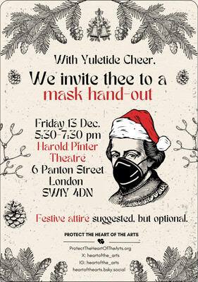 LONDON, DECEMBER 12, 2024 – Protect the Heart of the Arts, a grassroots advocacy group focused on COVID safety in the performing arts, will distribute FFP2 masks and COVID-19 tests outside London’s Harold Pinter Theatre on December 13 from 5:30 to 7:30 p.m., as audiences gather for Macbeth, starring Cush Jumbo and David Tennant.